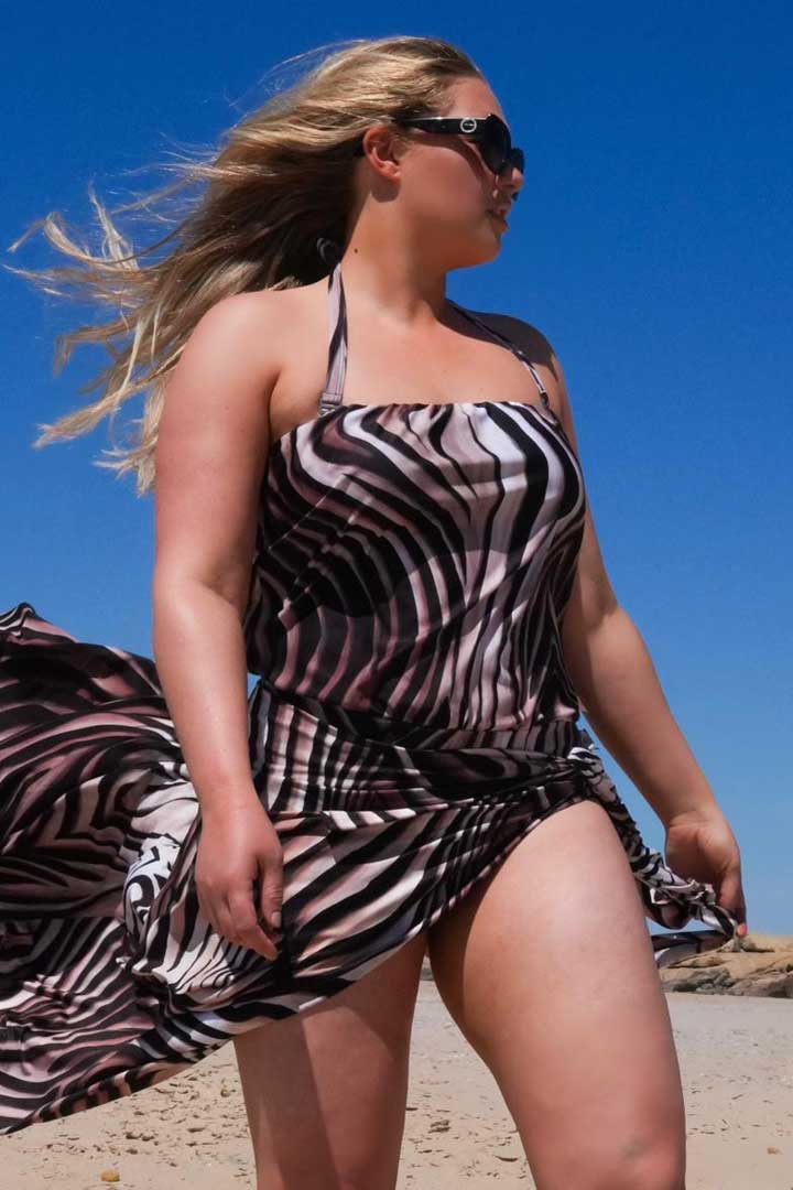Traje de Baño enterizo, abuchonada a la cintura. Corpiño interno con bolsillo para relleno o taza. Estampada modelo EVA Tigre.