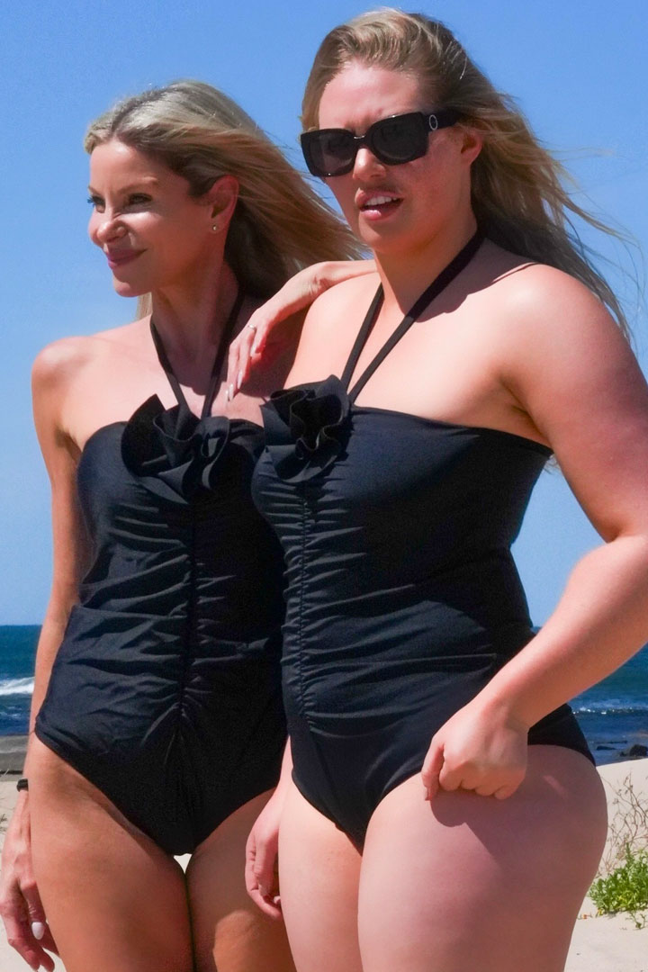 Detalle de volado rígido en forma de flor en el centro. Frunce central que estiliza la silueta y realce con efecto modelador.